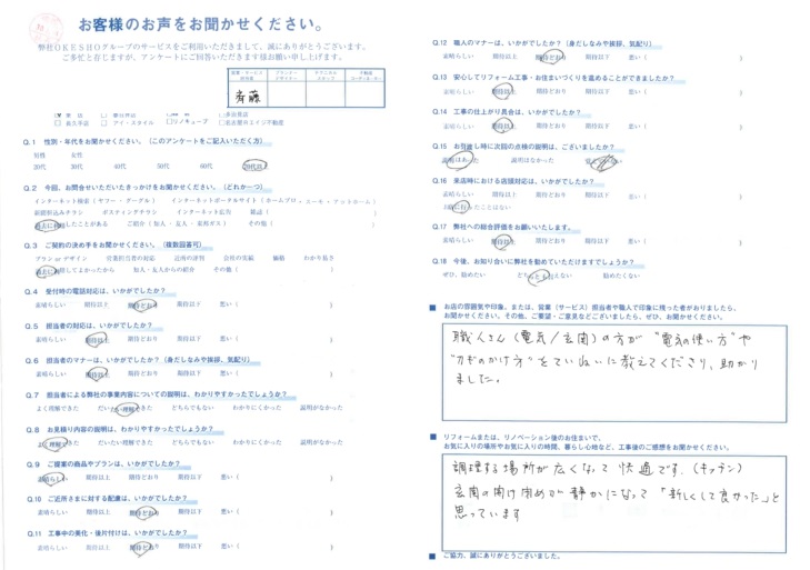お店の雰囲気や印象。または、営業(サービス)担当者や職人で印象に残った者がおりましたら、お聞かせください。その他、ご要望・ご意見などございましたら、ぜひ、お聞かせください。