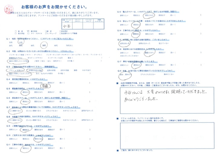 お店の雰囲気や印象。または、営業(サービス)担当者や職人で印象に残った者がおりましたら、お聞かせください。その他、ご要望・ご意見などございましたら、ぜひ、お聞かせください。