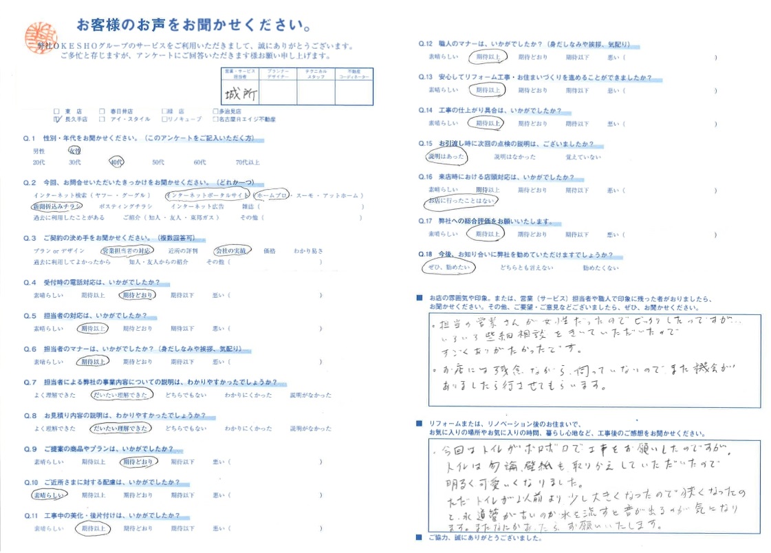 ただトイレが以前より少し大きくなったので 狭くなったのと 水道管が古いのか水を流すと音が出るのが気になります。また なにかあったらお願いいたします。