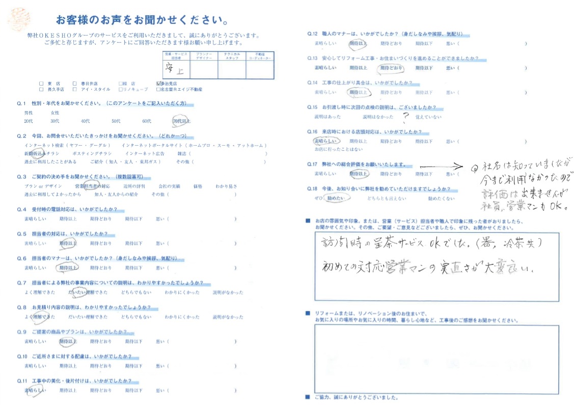 お店の雰囲気や印象。または、営業(サービス)担当者や職人で印象に残った者がおりましたら、お聞かせください。その他、ご要望・ご意見などございましたら、ぜひ、お聞かせください。