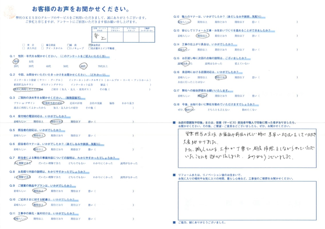 お店の雰囲気や印象。または、営業(サービス)担当者や職人で印象に残った者がおりましたら、お聞かせください。その他、ご要望・ご意見などございましたら、ぜひ、お聞かせください。