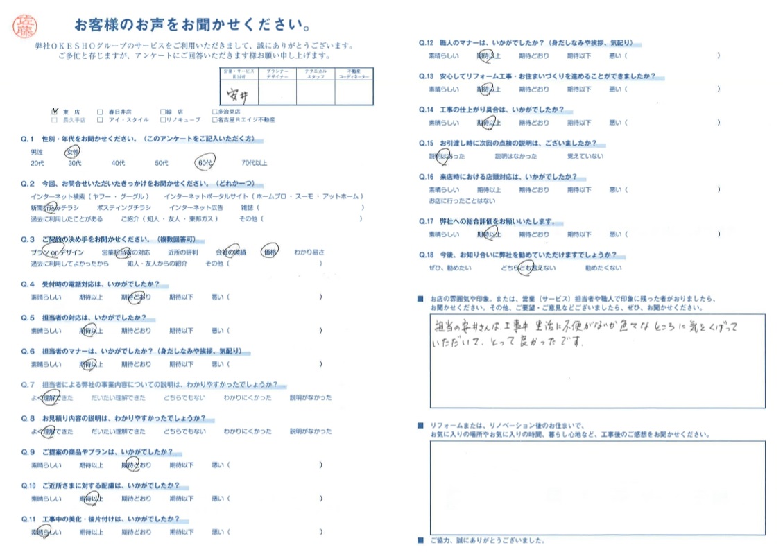 担当の安井さんは、工事中 生活に不便がないか色々なところに気をくばっていただいて とっても良かったです。