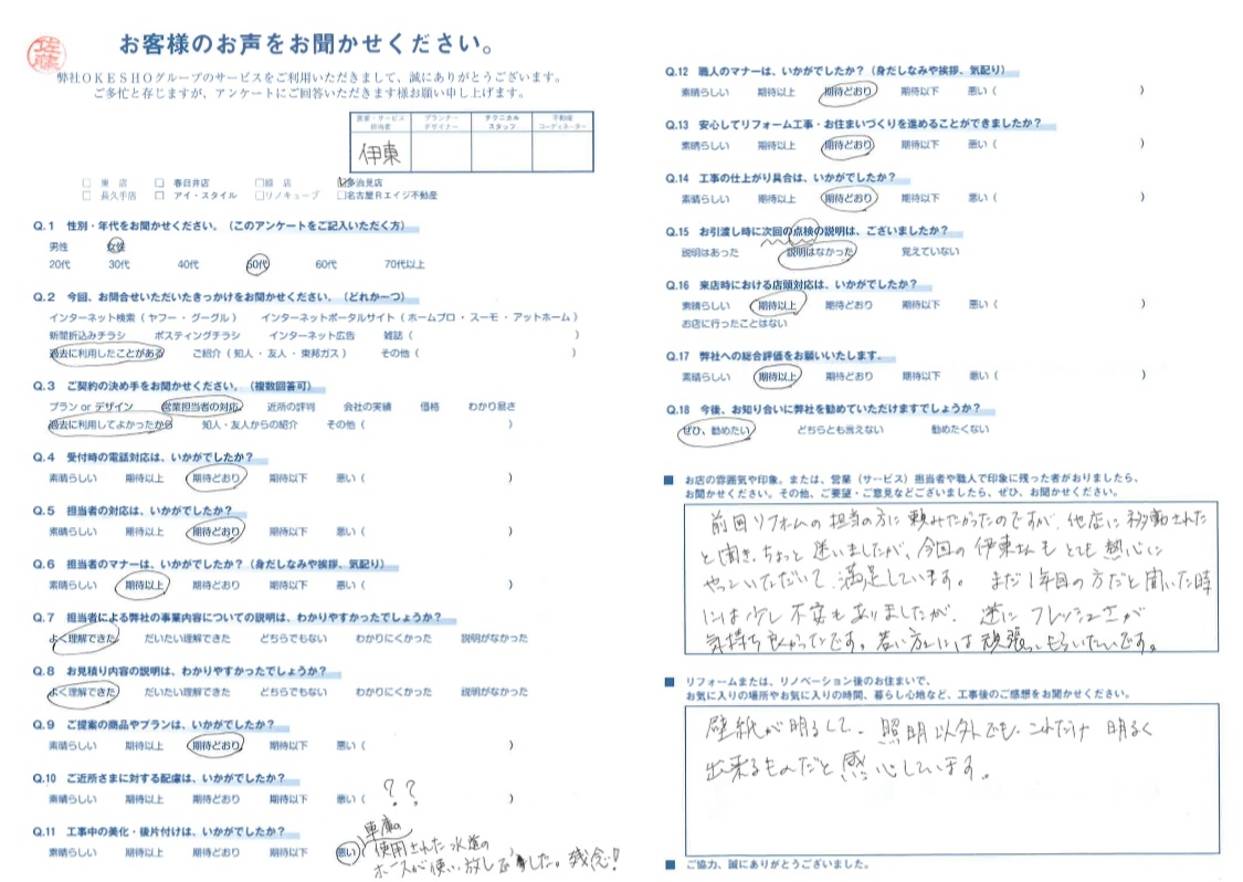 前回リフォームの担当の方に頼みたかったのですが、他店に移動されたと聞き、ちょっと迷いましたが、今回の伊東さんんも とても熱心にやっていただいて満足しています。まだ1年目の方だと聞いた時には少し不安もありましたが、逆にフレッシュさが気持ち良かったです。若い方には頑張ってもらいたいです。