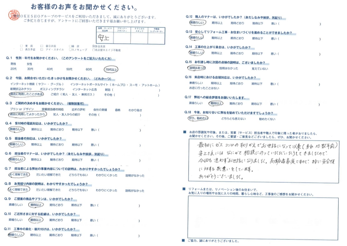 最初にガスコンロの取りかえでお世話になって以来(多分10数年前)安上さんには なにかと相談にのっていただいたりしてきましたので、今回も迷わずお世話になりました。高齢者家族ですので 特に安全性に対する気遣いをしています。