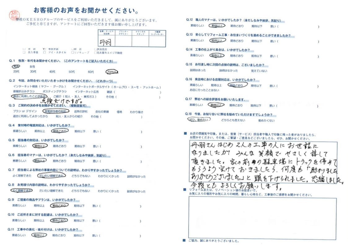 丹羽さんはじめ 2人の工事の人にお世話になりましたが、みんな笑顔でやさしく接して頂きました。家の前の駐車場にトラックを停めてもらうよう空けておきましたら、何度も「助かりました。ありがとうございました。」と頭を下げられました。恐縮しました。今後ともよろしくお願いします。