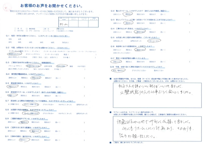 快適な住心地で御社に依頼して良かった。他にもリフォームしたい計画があり、そのおりも協力お願い致したい。