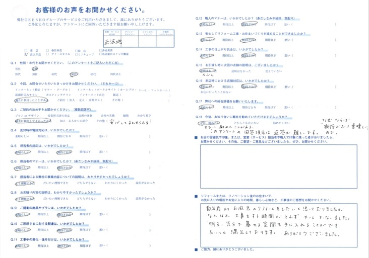 数年前よりお風呂のリフォームをしたいと思っておりましたが、なかなか工事をする時間がとれず やっとかないました。明るい気分で暮らせる空間を手に入れることができ たいへん満足しております。ありがとうございました。