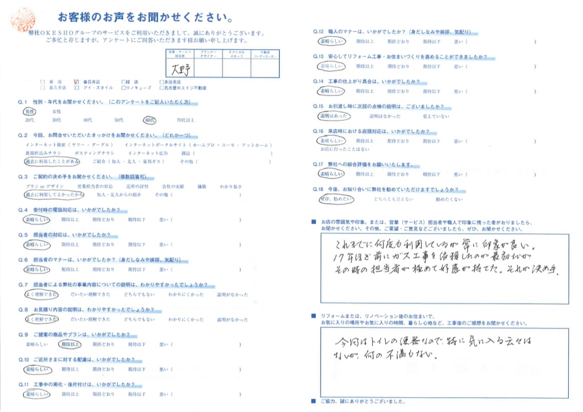 17年ほど前にガス工事を依頼したのが最初だが、その時の担当者が極めて好感が持てた。それが決め手。