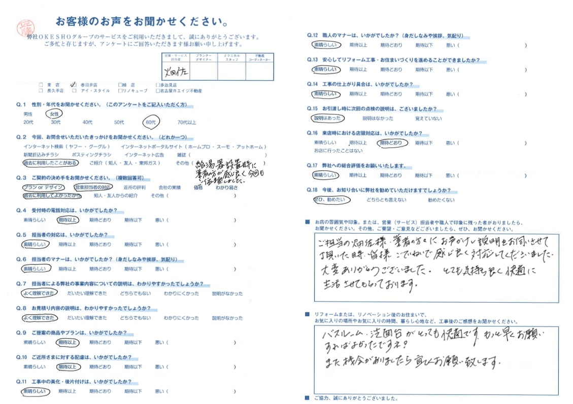 ご担当の畑佐様、業者の方々にお声かけし説明をお伺いさせて頂いた時、皆様 ごていねいで感じ良く対応してくださいました。大変ありがとうございました。とても気持ち良く快適に生活させてもらっております。