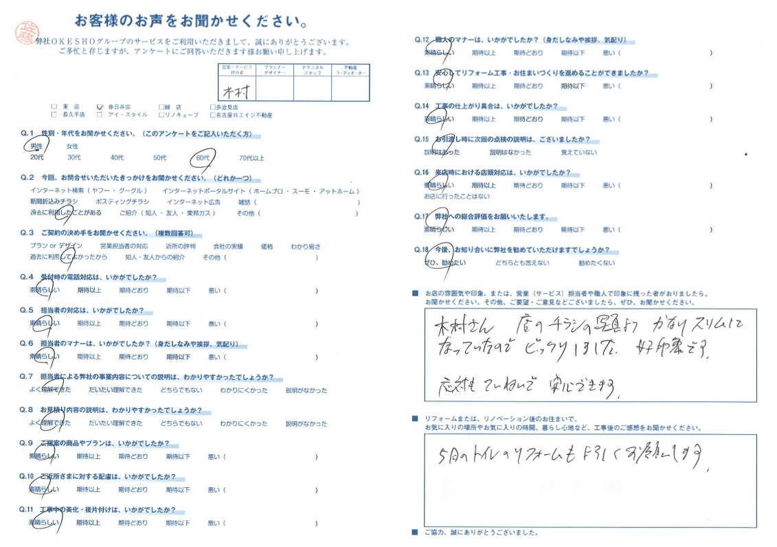 お店の雰囲気や印象。または、営業(サービス)担当者や職人で印象に残った者がおりましたら、お聞かせください。その他、ご要望・ご意見などございましたら、ぜひ、お聞かせください。