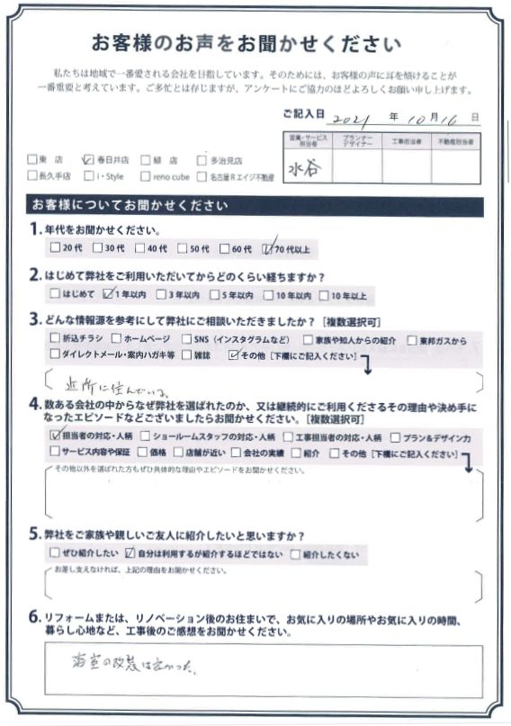 リフォームまたは、リノベーション後のお住まいで、お気に入りの場所やお気に入りの時間、暮らし心地など、工事後のご感想をお聞かせください。