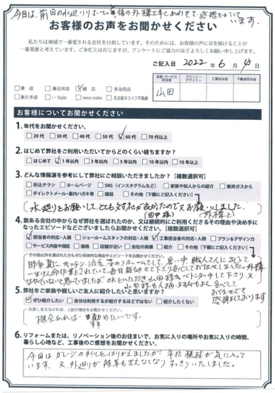 昨年夏にキッチン・浴室等のリフォームをして、暑い中 職人さんにまじって一生懸命作業をされていて 毎日顔もみせて下さり安心してお任せしました。外構はやっていないと思っていましたが、OKをいただき山田様へバトンタッチして下さり 又 山田様も人柄・対応もよく安心してお任せでき感謝しております。