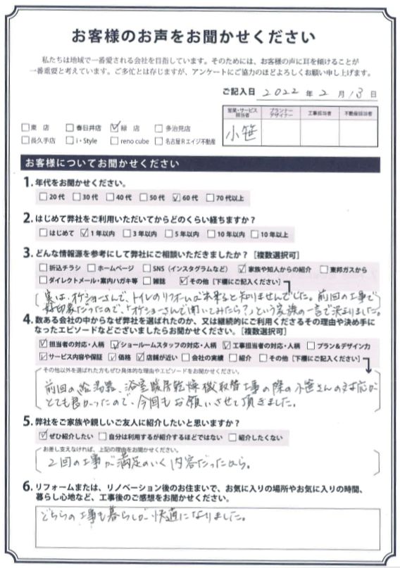 前回の給湯器・浴室暖房乾燥機取替工事の際の小笹さんの対応がとても良かったので、今回もお願いさせて頂きました。