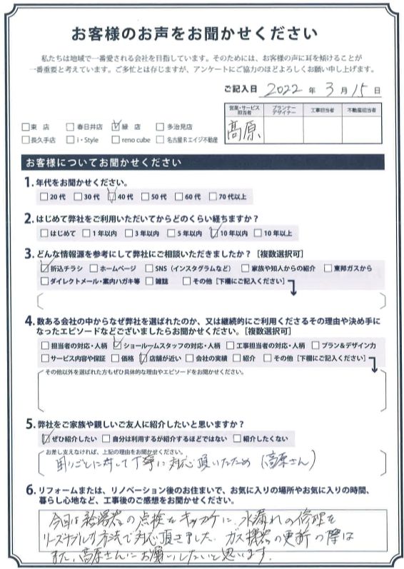 今回は給湯器の点検をキッチンに水漏れの修理をリーズナブルな方法で対応して頂きました。ガス機器の更新の際は また髙原さんにお願いしたいと思います。