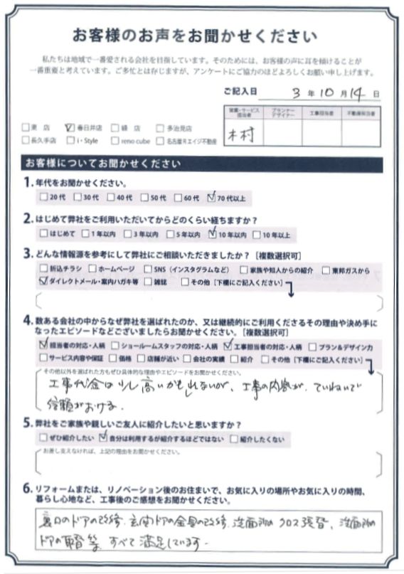 裏口のドアの改修、玄関ドアの金具の改修、洗面所のクロス張替、洗面所のドアの取替等 すべて満足しています。
