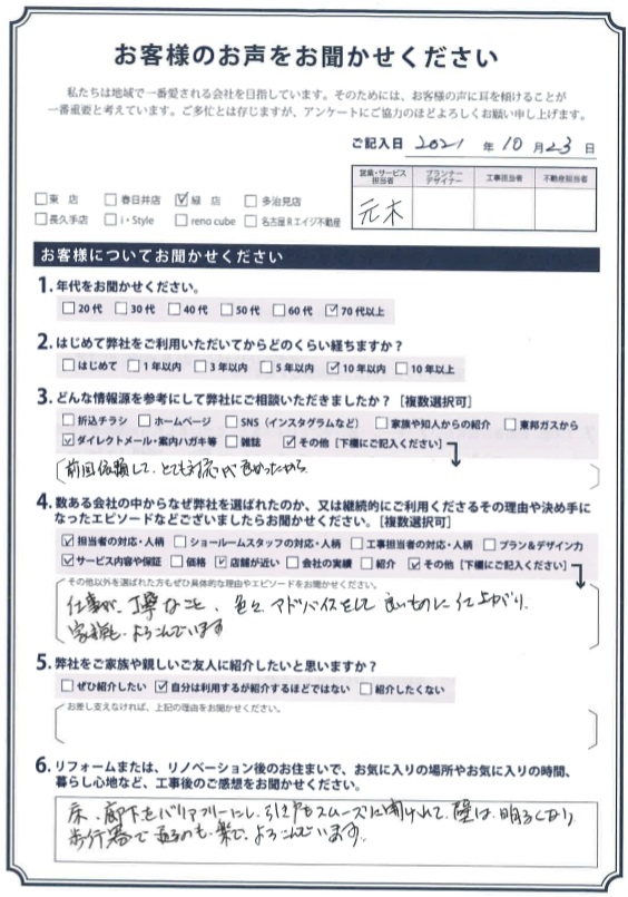 仕事が丁寧なこと。色々アドバイスをして良いものに仕上がり、家族もよろこんでいます。