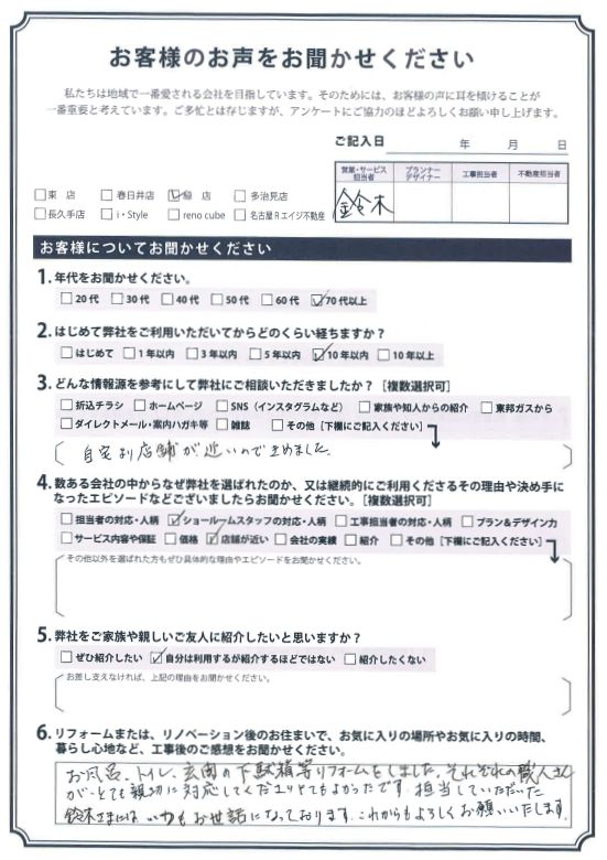 お風呂・トイレ・玄関の下駄箱等リフォームをしました。それぞれの職人さんがとても親切に対応してくださり とてもよかったです。担当していただいた鈴木様には いつもお世話になっております。これからもよろしくお願いいたします。