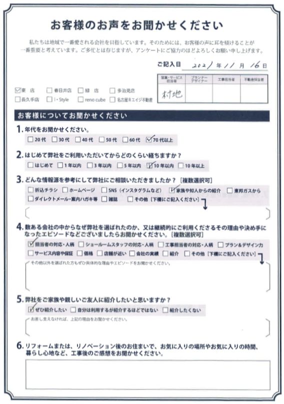 10年ほどご利用いただいている 70代以上のお客様