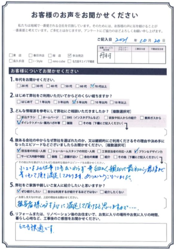 リフォームまたは、リノベーション後のお住まいで、お気に入りの場所やお気に入りの時間、暮らし心地など、工事後のご感想をお聞かせください。