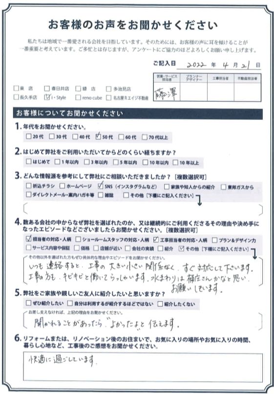 いつも連絡すると、工事の大きい小さい関係なく すぐ対応して下さいます。工事の方もキビキビと働いてらっしゃいます。水まわりは桶庄さんかなと思いお願いしています。
