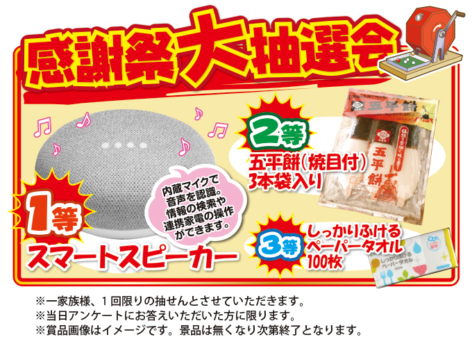 ご来場いただくと、スマートスピーカーなどが当たる感謝祭大抽選会にもれなくご参加いただけます。