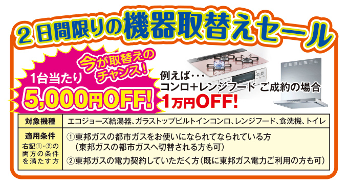 ガスコンロ・レンジフード・給湯器・食洗機・水栓・トイレ・キッチン・バスなどのリフォームをお考えの方はぜひこの機会をお見逃しなく。