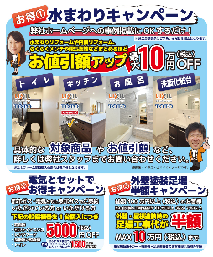 水まわり設備のリフォーム、ガス機器の購入、外壁・屋根塗装など、お住まいのグレードアップに幅広くご活用いただけるキャンペーンです