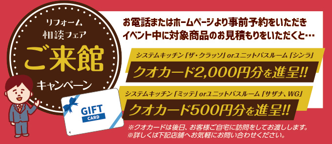 予約なしのご来場も大歓迎ですが、事前予約をいただきイベント当日にお見積もりをいただくとクオカードを進呈!