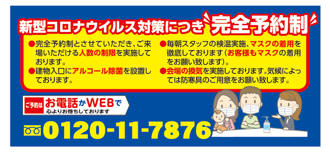 新型コロナウィルス対策につき“完全予約制”です。ご来場いただける人数の制限を実施しておりますので、どうぞご協力のほどよろしくお願いいたします。