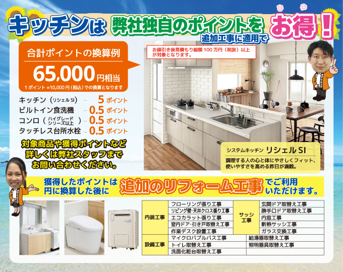 キッチンリフォームは、システムキッチンやビルトイン食洗機、タッチレス台所水栓などを導入することでポイントが獲得できます。どの商品で何ポイント獲得できるかは、弊社スタッフまでお問い合わせください。獲得したポイントは追加のリフォーム工事(内装工事、サッシ工事、設備工事)に利用できます。