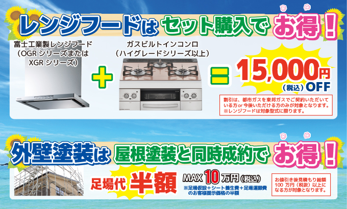富士工業製レンジフード(OGRシリーズまたはXGRシリーズ)とガスビルトインコンロ(ハイグレードシリーズ以上)を同時購入で、15,000円OFF(税込)