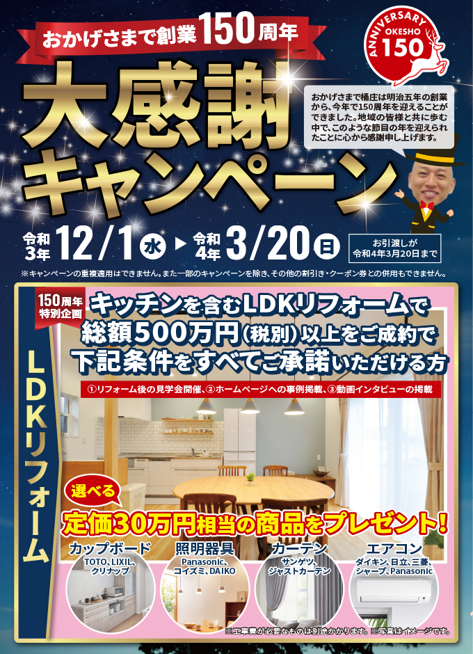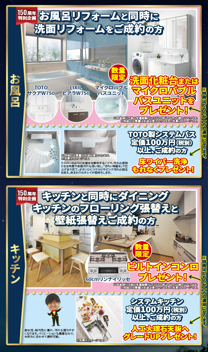 おかげさまで創業150周年大感謝キャンペーン 水まわりリフォームを中心にお得なご成約特典をご用意いたしました!