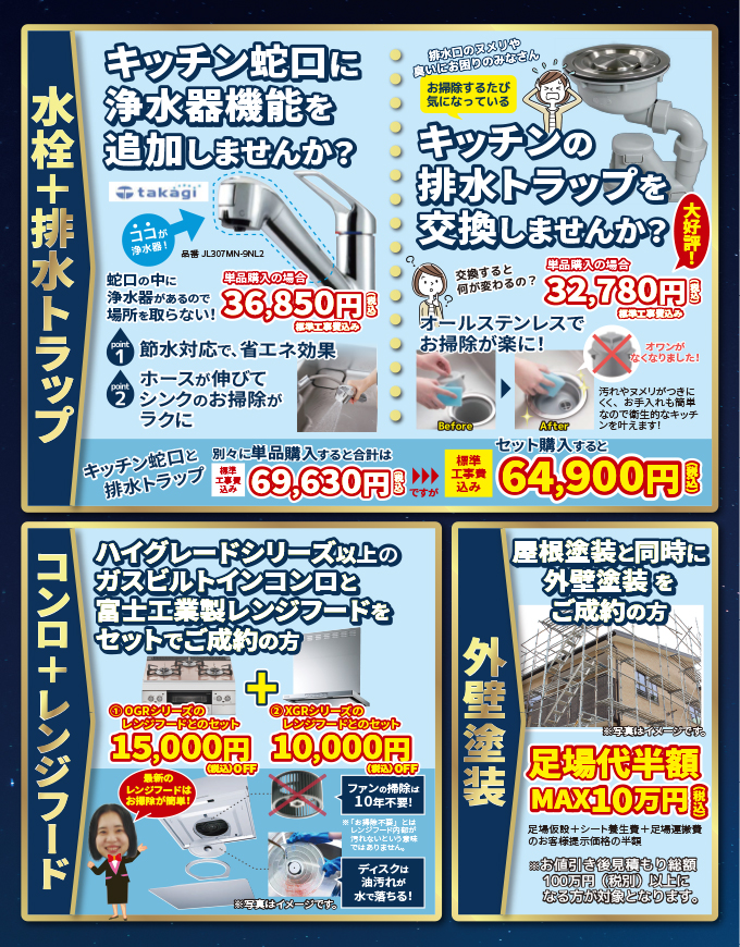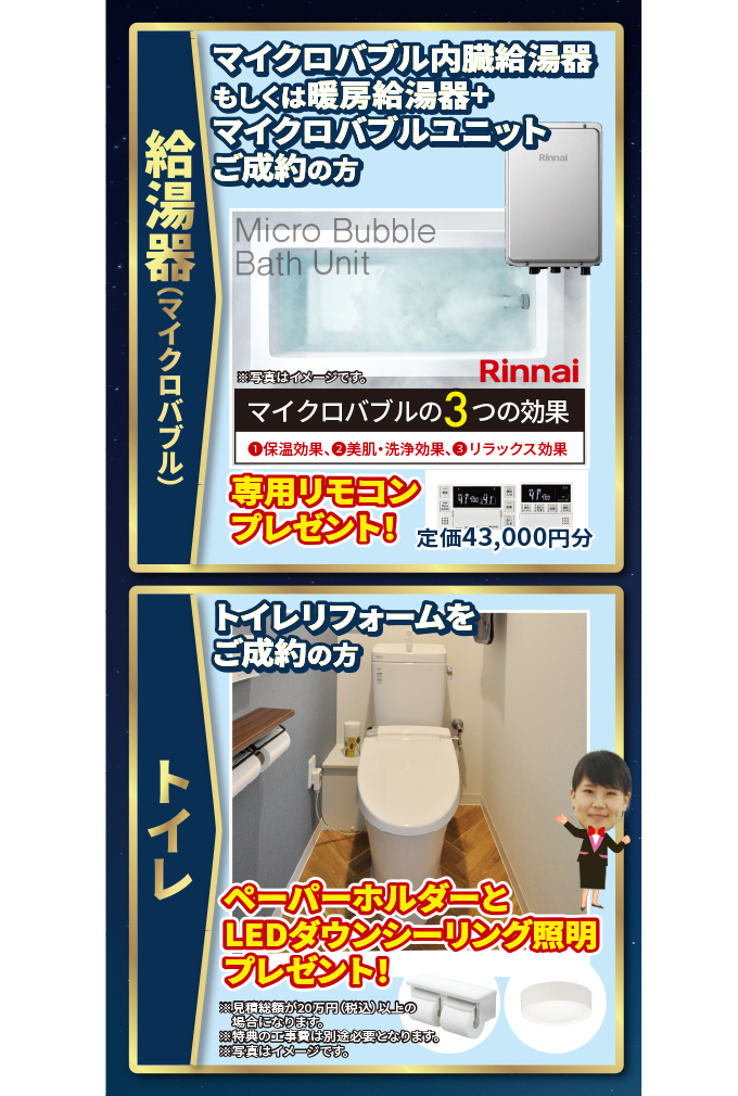 LDK・キッチン・お風呂・給湯器(マイクロバブル)・トイレのリフォーム、水栓・排水トラップの取替え、コンロ+レンジフードの取替え、外壁・屋根塗装など、お住まいのグレードアップに幅広くご活用いただけるキャンペーンです