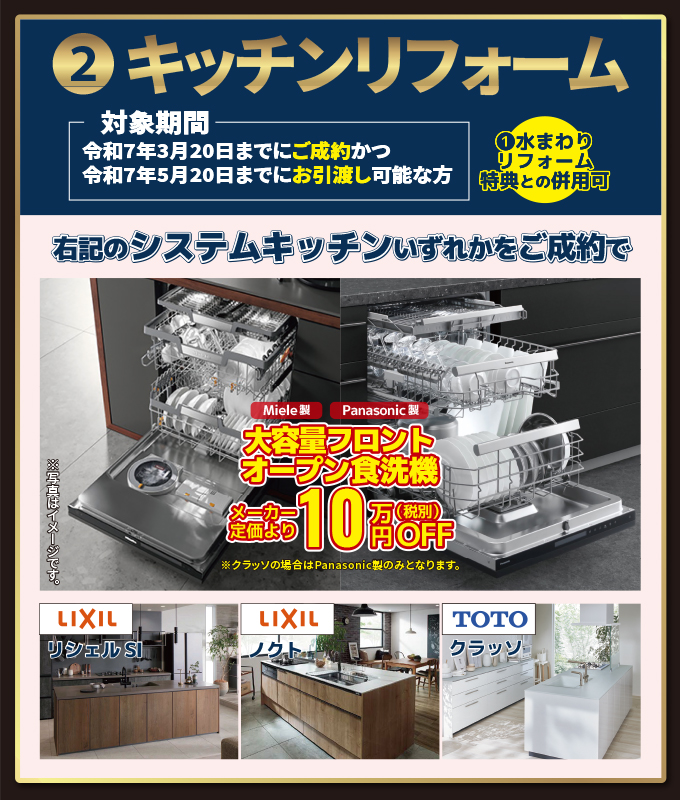 下記のシステムキッチンいずれかをご成約で大容量フロントオープン食洗機 メーカー定価より10万円(税別)OFF!