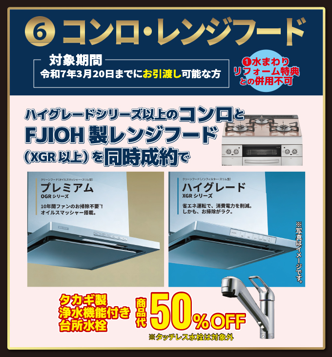 ハイグレードシリーズ以上のコンロとFJIOH製レンジフード(XGR以上)を同時成約でタカギ製浄水機能付き台所水栓、商品代50%OFF