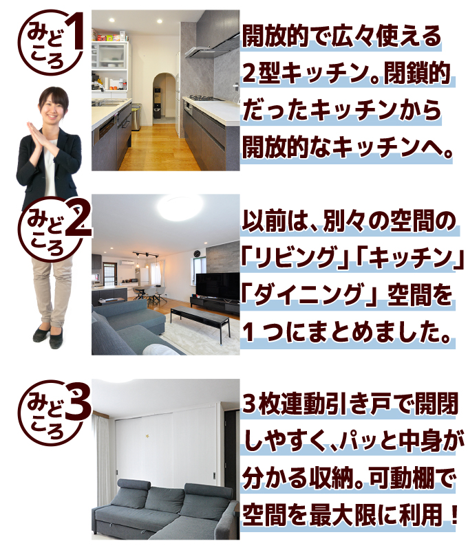 開放的で広々使える2型キッチン。閉鎖的だったキッチンから開放的なキッチンへ。 / 以前は、別々の空間の「リビング」「キッチン」「ダイニング」空間を1つにまとめました。 / 3枚連動引き戸で開閉しやすく、パッと中身が分かる収納。可動棚で空間を最大限に利用!