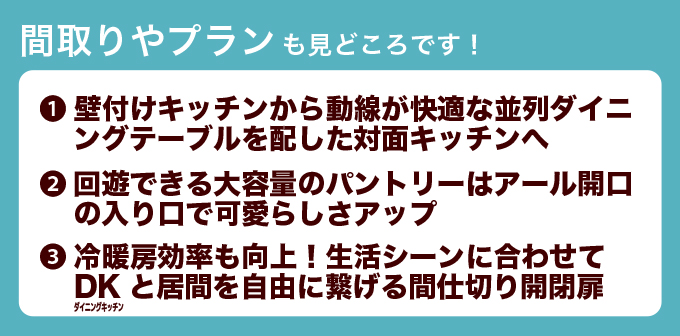 壁付けキッチンから動線が快適な並列ダイニングテーブルを配した対面キッチンへ / 回遊できる大容量のパントリーはアール開口の入り口で可愛らしさアップ / 冷暖房効率も向上!生活シーンに合わせてDKと居間を自由に繋げる間仕切り開閉扉