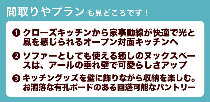 クローズキッチンから家事動線が快適で光と風を感じられるオープン対面キッチンへ / ソファーとしても使える癒しのヌックスペースはアールの垂れ壁で可愛らしさアップ / キッチングッズを壁に飾りながら収納を楽しむお洒落な有孔ボードのある回遊可能なパントリー