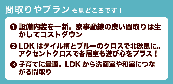 設備内装を一新。家事動線の良い間取りは生かしてコストダウン / LDKはタイル柄とブルーのクロスで北欧風に。アクセントクロスで各居室も遊び心をプラス! / 子育てに最適。LDKから洗面室や和室につながる間取り