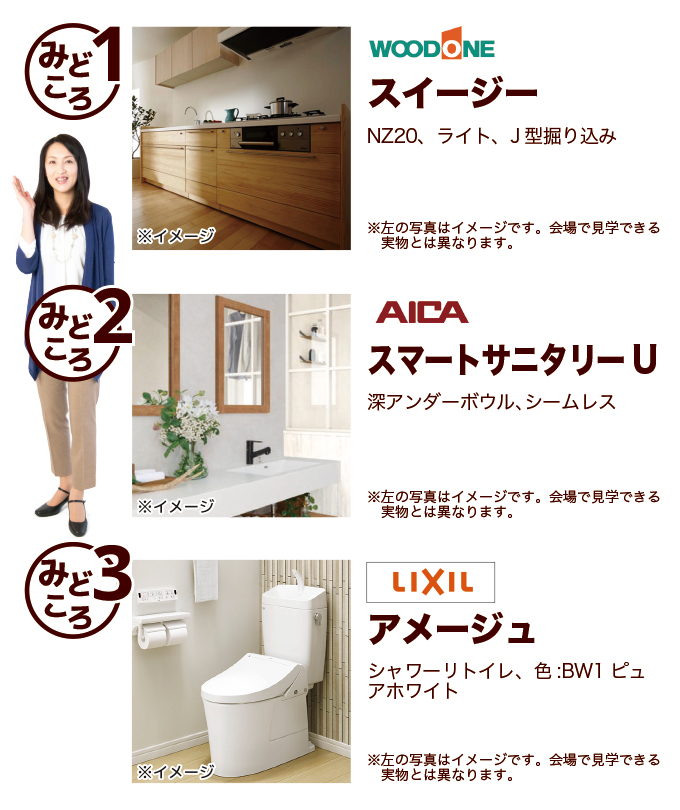 ①WOODONE/スイージー:NZ20、ライト、J型掘り込み ②AICA/スマートサニタリーU:深アンダーボウル、シームレス ③LIXIL/アメージュ:シャワーリトイレ、色:BW1ピュアホワイト