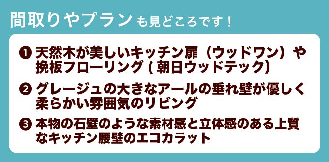 ①天然木が美しいキッチン扉(ウッドワン)や挽板フローリング(朝日ウッドテック)。 ②グレージュの大きなアールの垂れ壁が優しく柔らかい雰囲気のリビング。 ③本物の石壁のような素材感と立体感のある上質なキッチン腰壁のエコカラット。