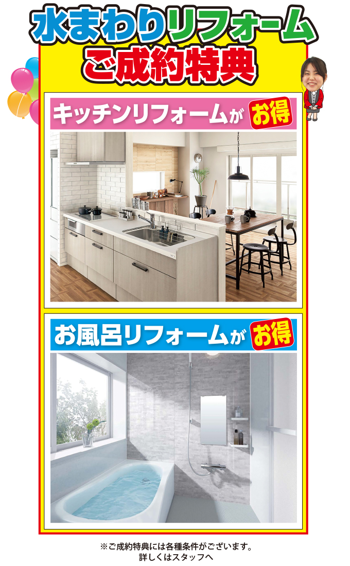 水まわり設備(キッチン、お風呂、トイレ)のリフォーム、ガスコンロ・レンジフード・浄水付水栓・ガスファンヒーターの購入など、お住まいのグレードアップに幅広くご活用いただける4週間限定のスペシャルセールです