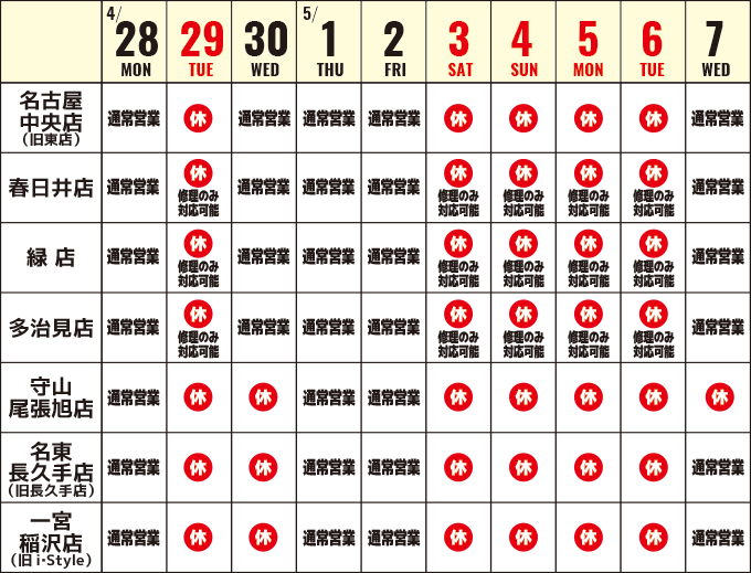なお修理・メンテナンスにつきましては、期間中も休まず対応をしております。何かお困りごとがございましたらどうぞお気軽にお電話ください。