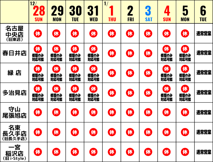 なお12月28日、12月29日、12月30日、12月31日、1月4日、1月5日は修理・メンテナンスのみ対応をしております。何かお困りごとがございましたらどうぞお気軽にお電話ください。
