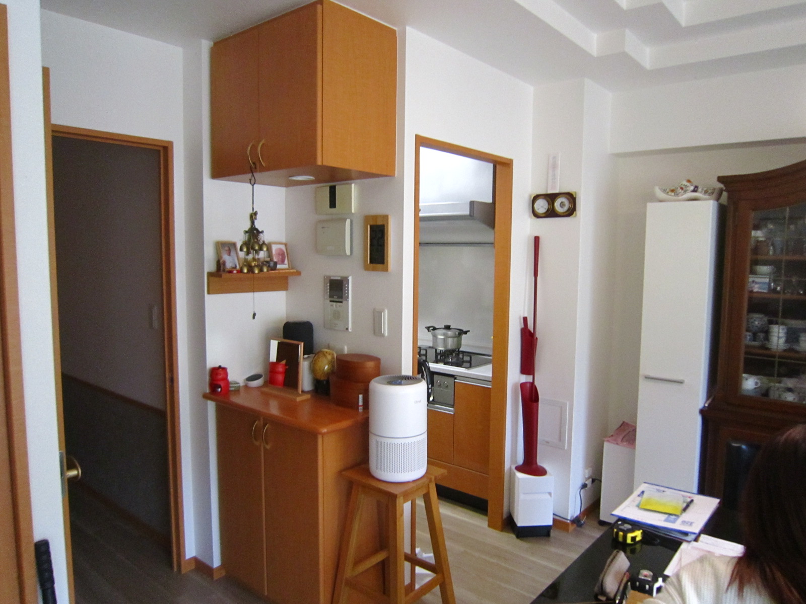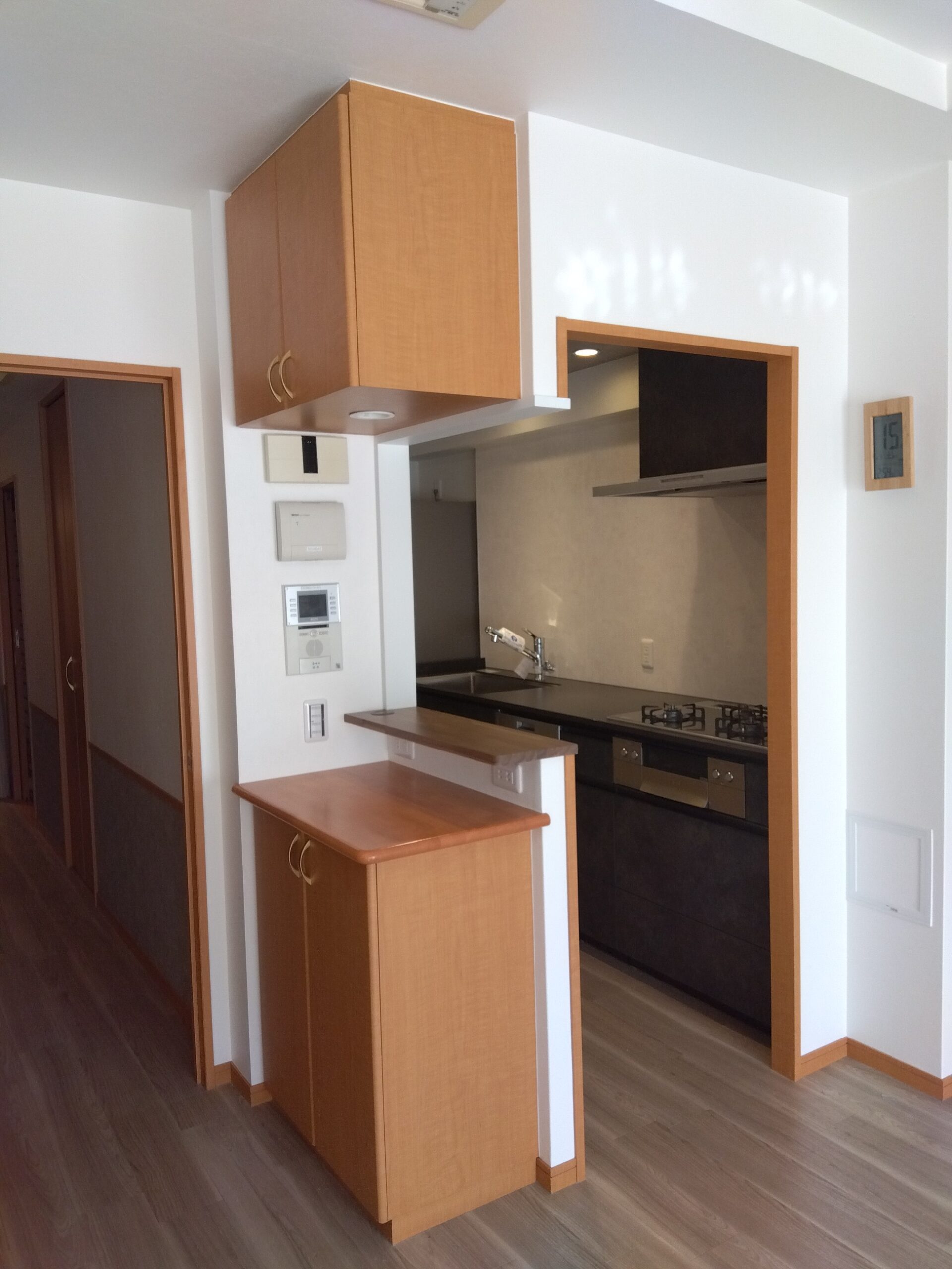 キッチンが個別のスペースという感じの間取りになっていた。少しでも解放感を感じることが出来るように間仕切壁の開口部を広くしました。
