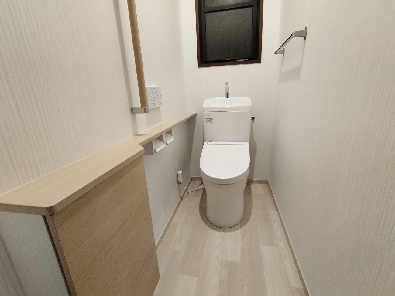 シンプルな商品構成ですがスッキリとした明るい空間となりました。フロア収納キャビネットのカウンターは手をついて体重をかけても大丈夫な強度、手摺も新規に取り付けて安全性も向上しました。