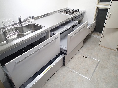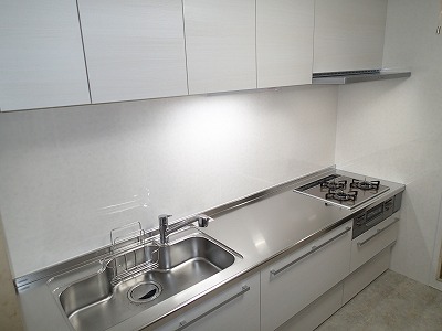 | 設備機器 メーカー 仕様 | システムキッチン クリナップ ラクエラ 内装工事 壁、天井クロス貼り 床クッションフロアー貼り(天井下地工事、床下地補修工事含む) |