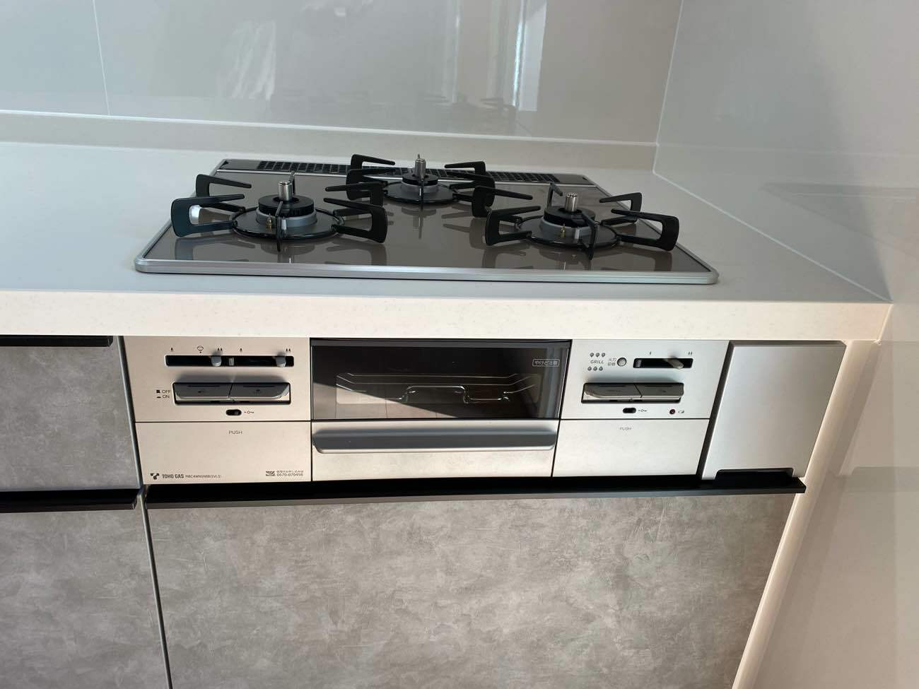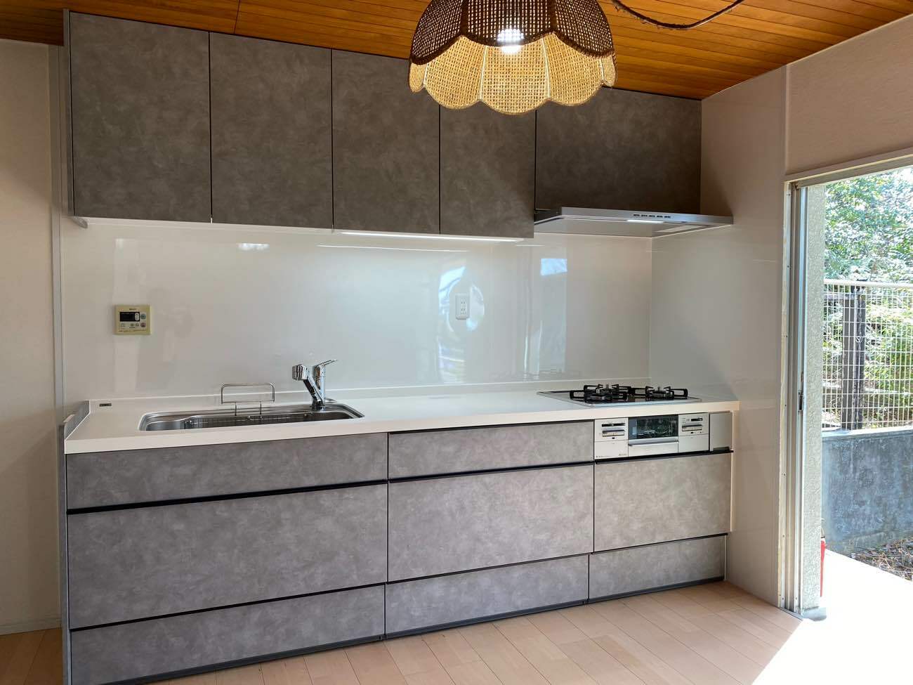 グレーのキッチンがスタイリッシュで素敵ですね。