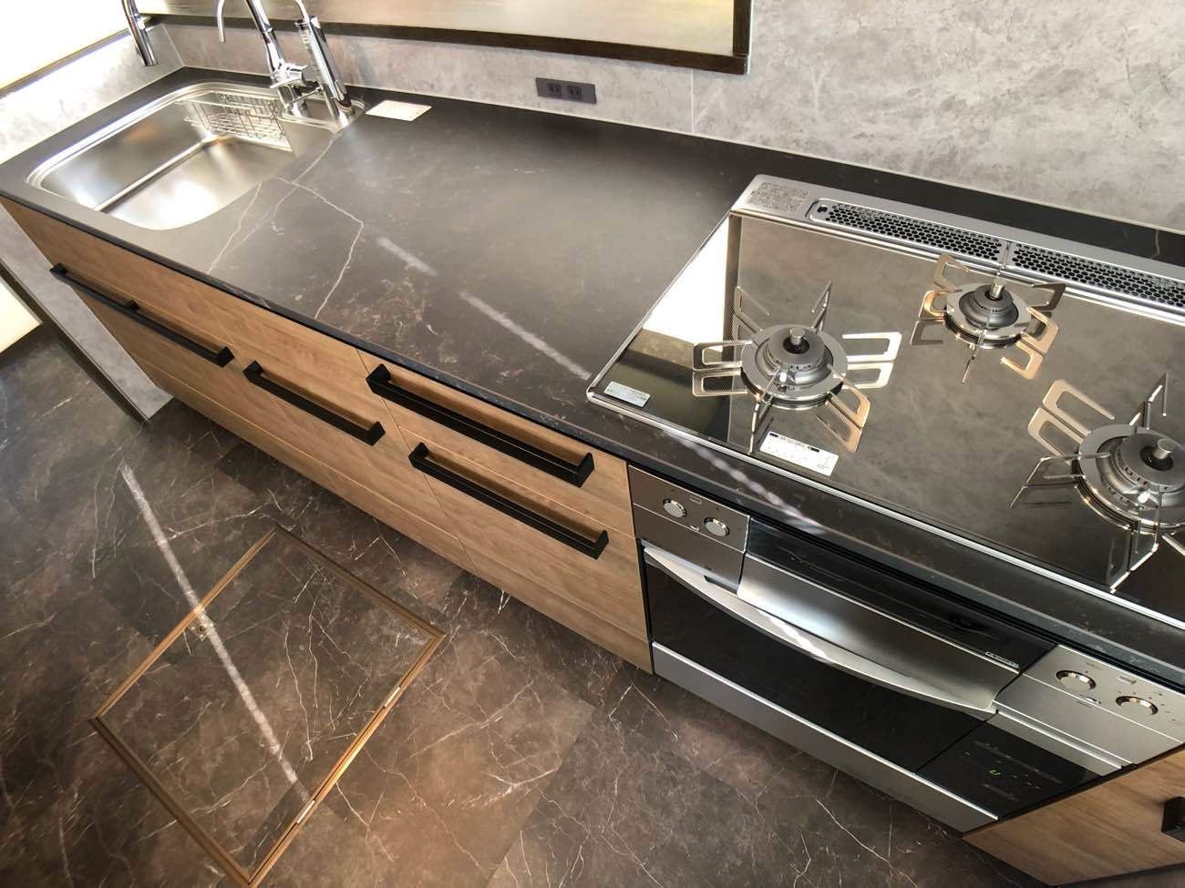 高級感を演出するためセラミックカウンターを軸にキッチンパネル、フロアタイルも併せてご提案しました。
