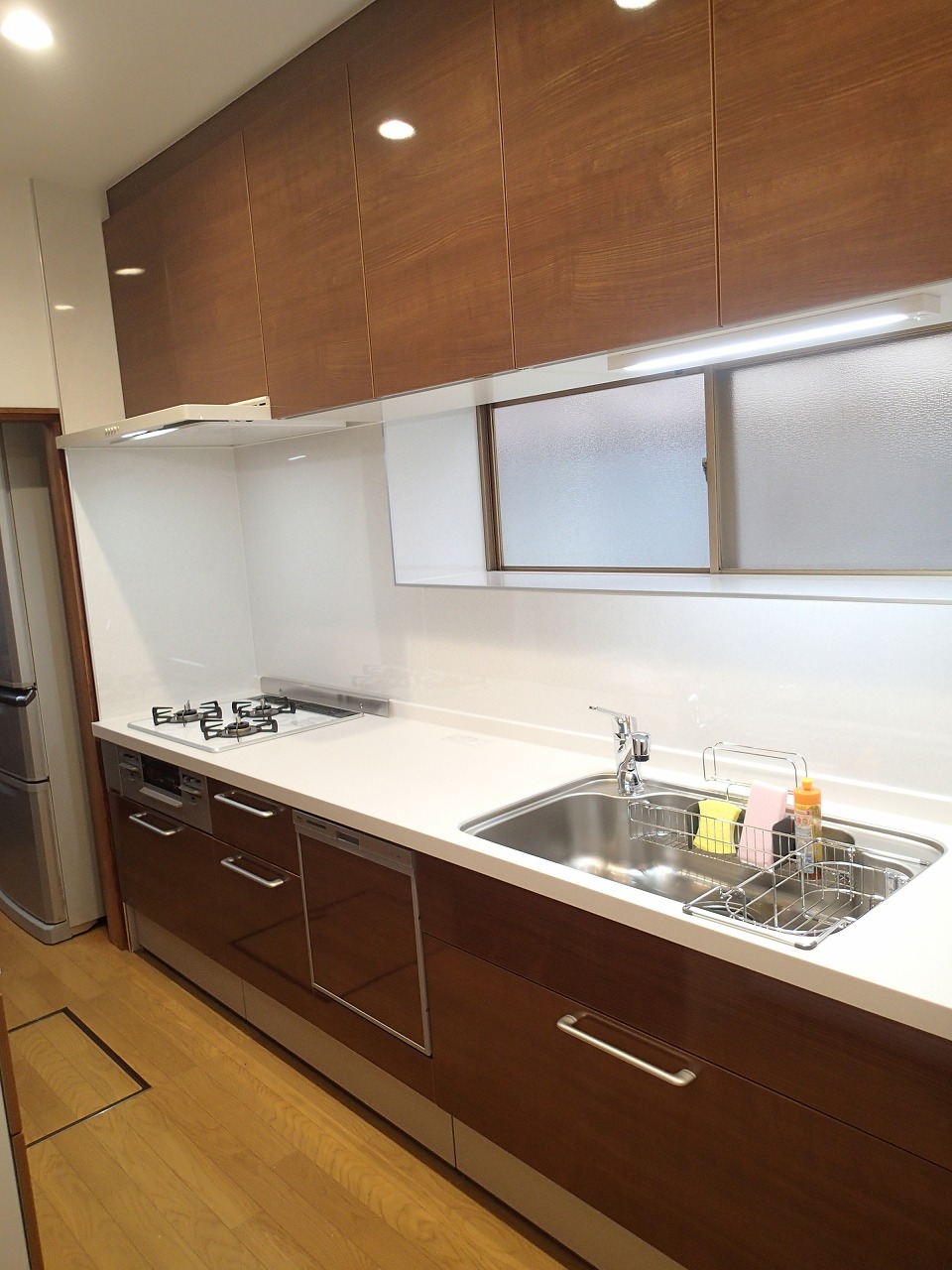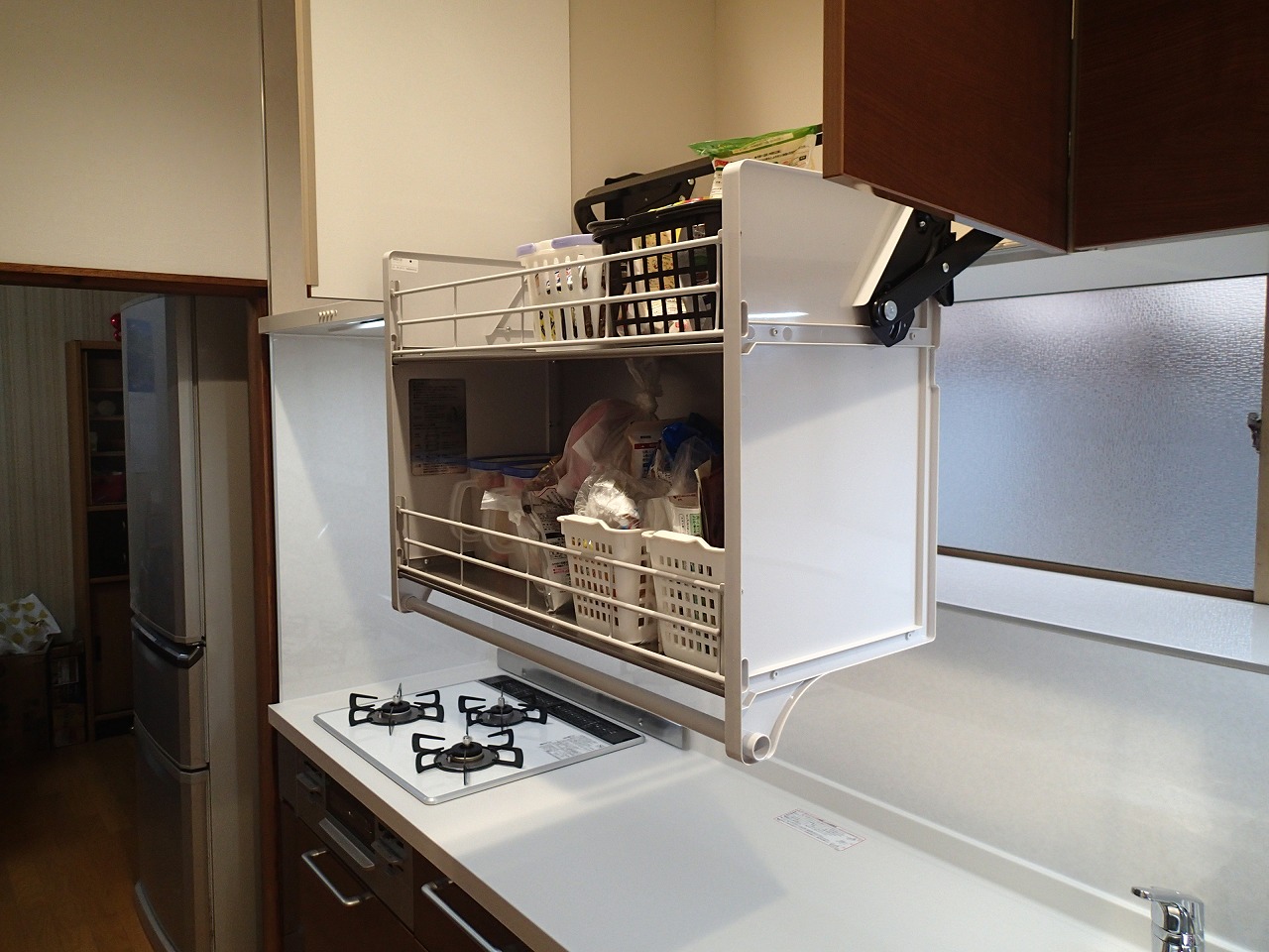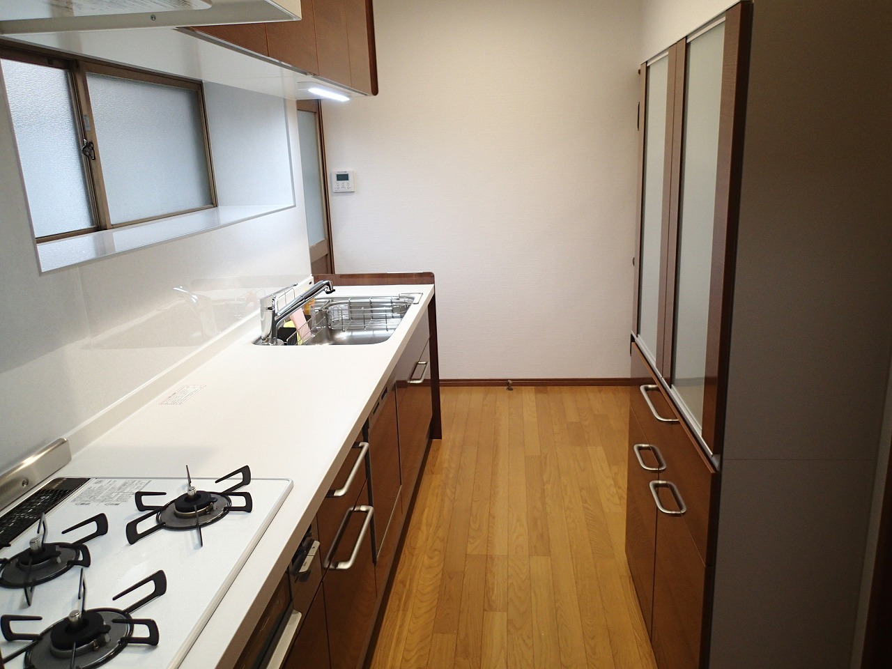 奥行き60センチのシステムキッチンと奥行き32センチのカップボードの組合せでコンパクトなキッチン空間でも無理なく設置出来ました